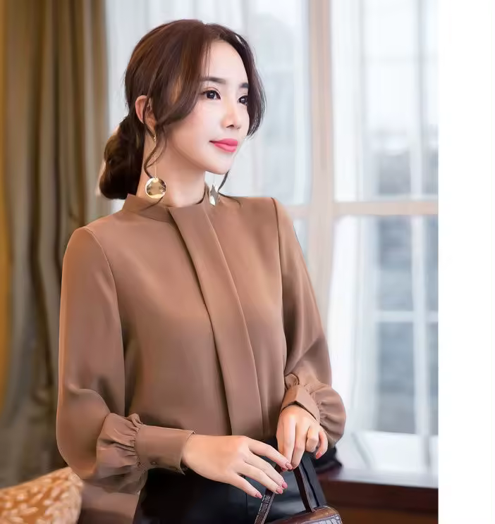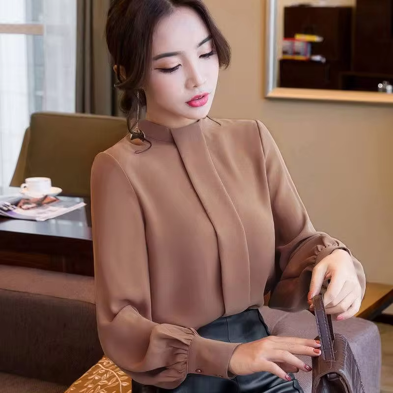 2022 nouvelle mode femmes dame à manches longues chemises couleur unie en mousseline de soie formelle ample Blouse bouton décor hauts chemise décontractée