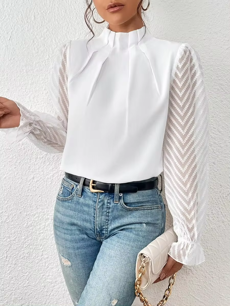 Femmes européennes américaines automne hiver nouveau col mi-haut épissage mousseline de soie ondulée à manches longues casual dame hauts chemisier chemise