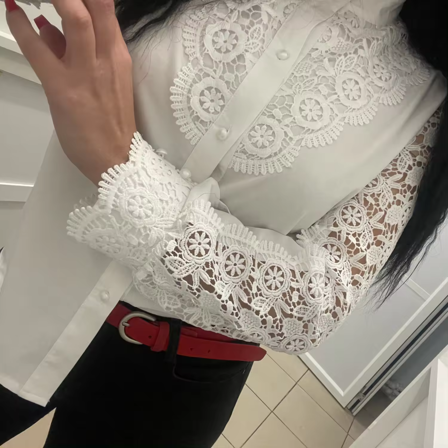 Summer Fashion New Women's Wear Design Sense White Lace Long Sleeve Lace Hollow Out Spot Shirts and Shirts Wholesale