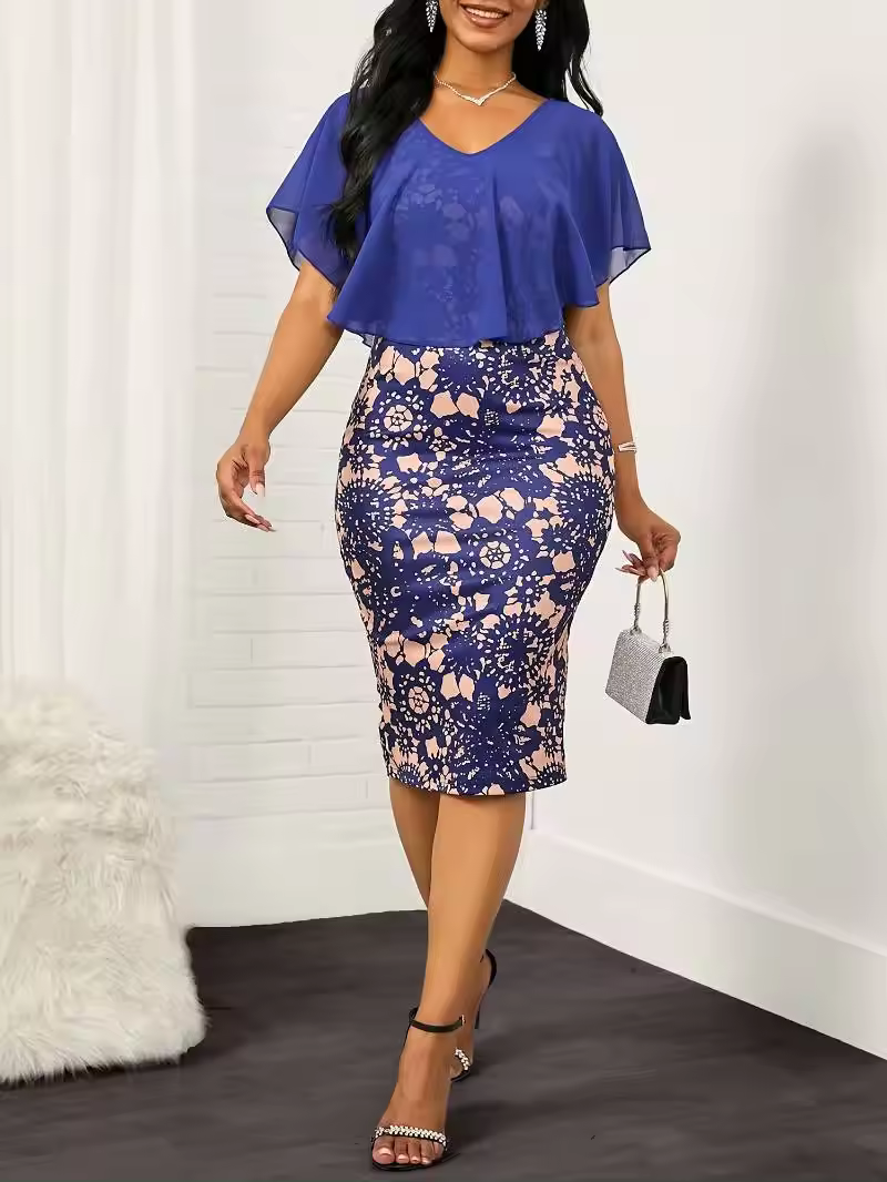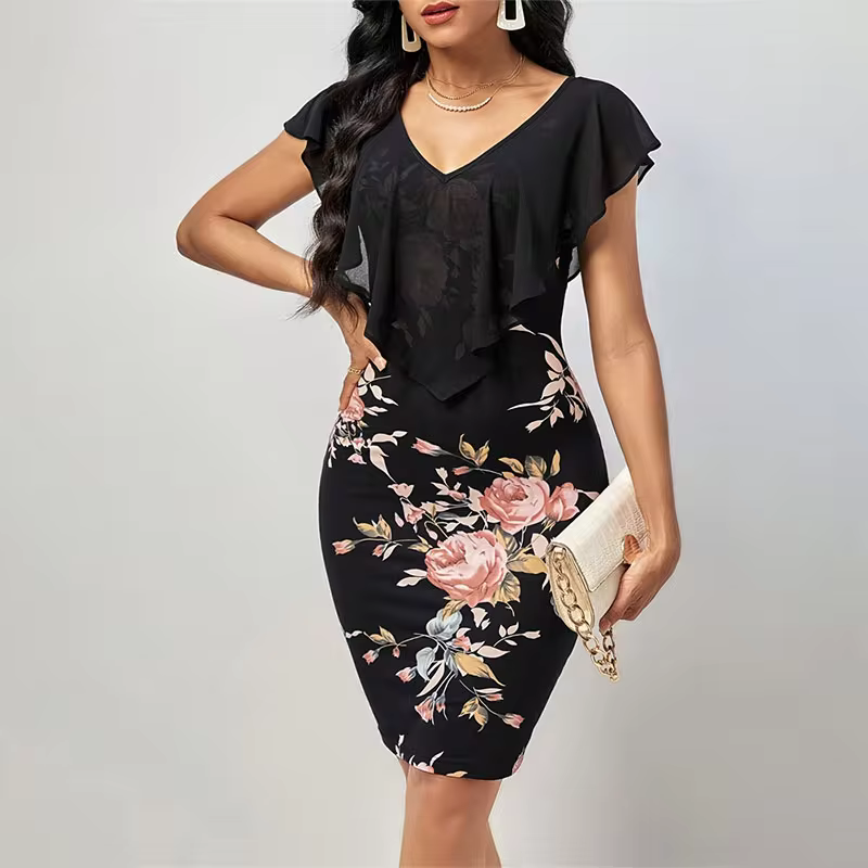 Fabricant de vêtements élégants pour femmes Ourlet à volants Crochet Dentelle Conception à volants imprimé coupe ajustée Col en V Robe décontractée