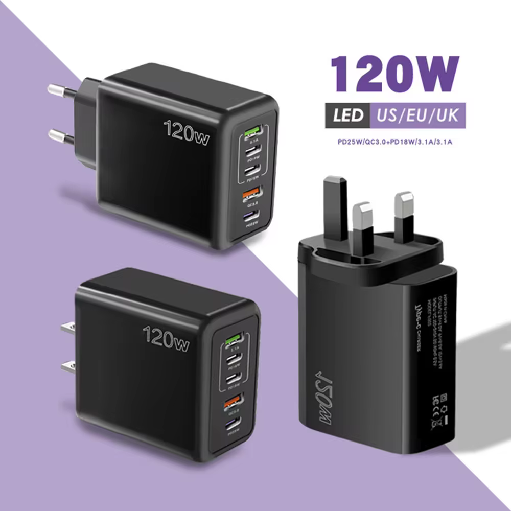 Chargeurs de USB-C 120W 3 PD Type C et 2 ports USB Charge super rapide Téléphone portable Prise domestique Adaptateur de voyage Chargeur mural USB