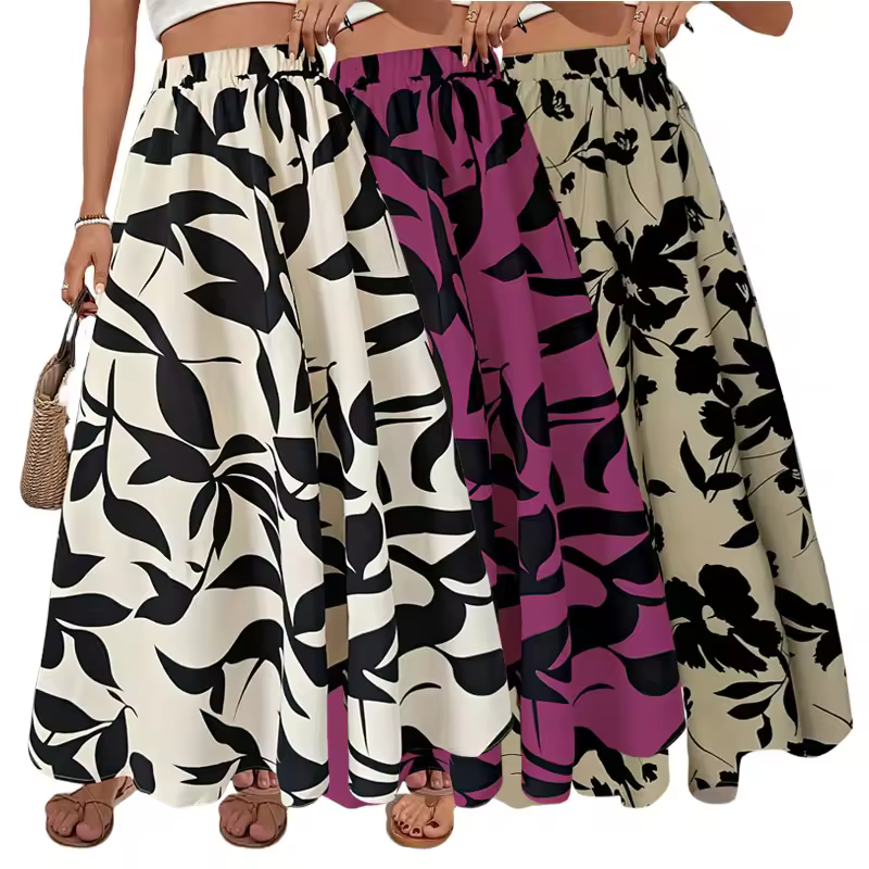 Femme été feuille imprimer a-ligne Maxi jupe femmes mode élastique taille haute en mousseline de soie Floral a-ligne jupes