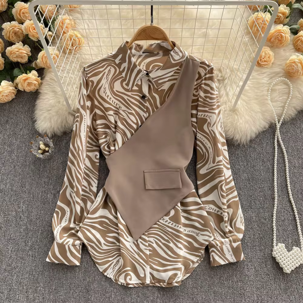 Mode nouvelle version coréenne du haut à manches longues lâche mince motif zèbre couture deux pièces chemise femmes