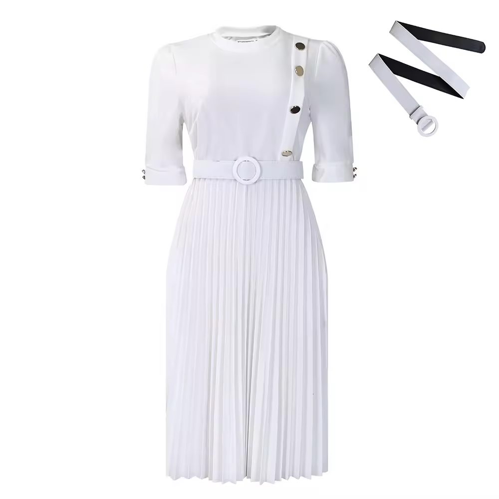 Femmes décontracté col rond solide élégant demi manches plissé bouton taille haute moulante robes mi-longues avec ceinture